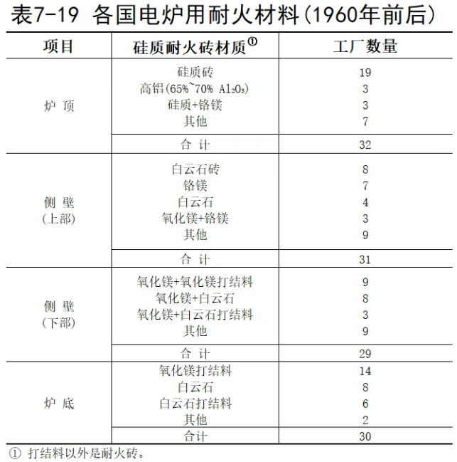 電爐與平爐同樣,電爐的耐火材料也可以分為爐頂、側(cè)壁以及爐底。1960年前后電爐耐火材料的使用狀況,由〇.Porkert對(duì)世界8個(gè)國(guó)家的33家工廠的堿性大型電爐所進(jìn)行的調(diào)查(表7-19)說(shuō)明了這方面的情況,當(dāng)時(shí)日本標(biāo)準(zhǔn)的使用形式是:
