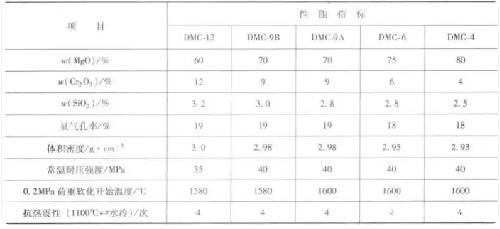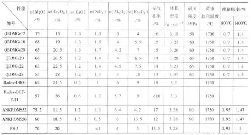 (3)提高配料中細(xì)粉的細(xì)度(例如當(dāng)細(xì)粉比表面積達(dá)到5m2/g時(shí)),再結(jié)合鎂鉻磚的抗熱震性顯著改善??傊?,采用優(yōu)選原料、超高溫?zé)傻戎拼u工藝,增加磚內(nèi)二次尖晶石生成量,可制得綜合性能高的精煉鋼罐渣線用直接結(jié)合、再結(jié)合(半再結(jié)合)鎂鉻磚內(nèi)某公司的幾種直接結(jié)合鎂鉻磚的典型性能見(jiàn)表1。國(guó)內(nèi)外再結(jié)合(半再結(jié)合)鎂鉻磚的典型性能見(jiàn)表2。