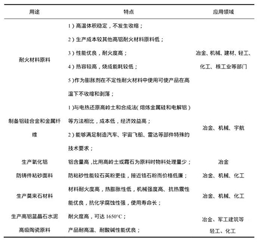 在工業(yè)生產(chǎn)中,藍晶石礦物主要作為生產(chǎn)耐火材料、氧化鋁、硅鋁合金和金屬纖維等的原料。其主要用途及優(yōu)點如表所示: